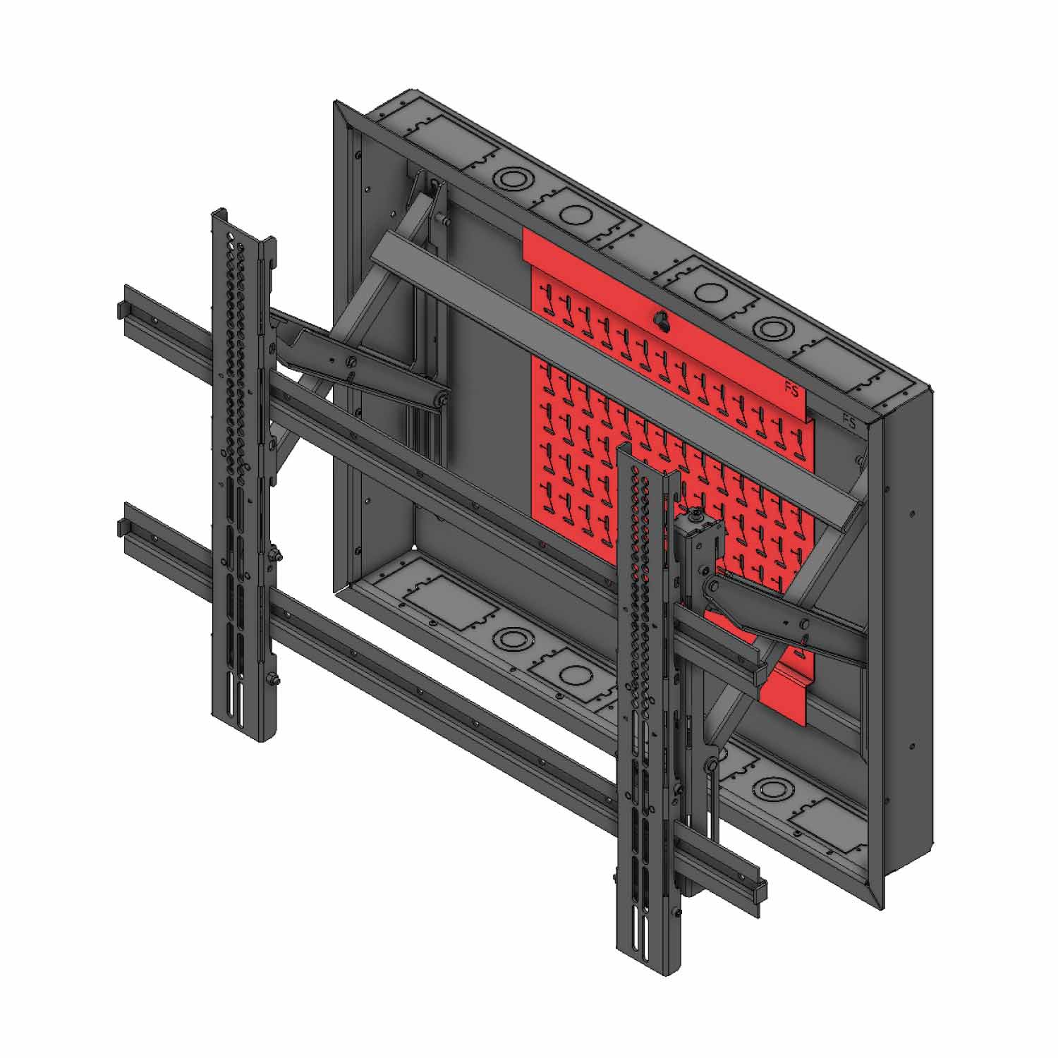 Our family of Wallmate mounting solutions provides support for flat panel displays by integrating the back box, display mount, and AV device mounting into one complete system.