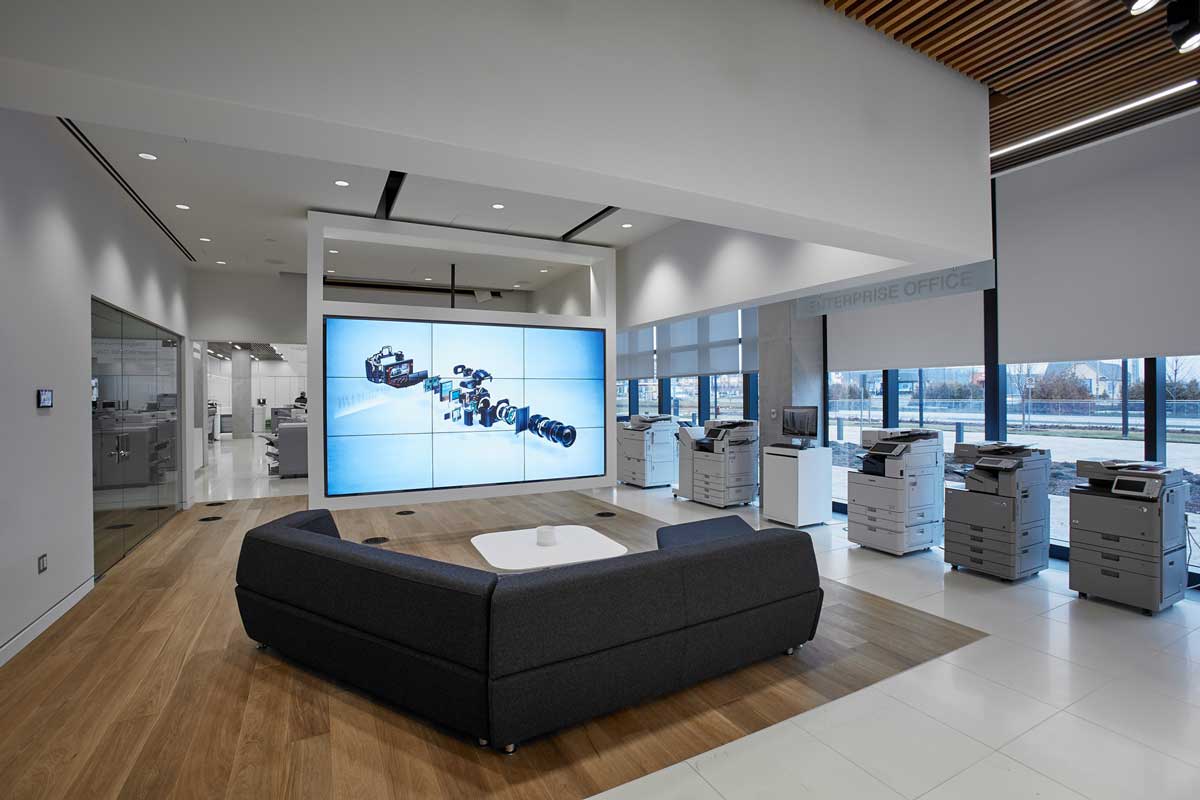 The Canon team wanted to create a meeting space that could support large gatherings in addition to small one-on-one meetings by incorporating a movable flat panel wall to span across the room. rp Visual Solutions (RPV) worked with AV Consultant, Smith + Andersen, and AV Integrator, Applied Electronics, to design and fabricate a solution for an architecturally integrated video wall, mounted on a motorized track system, for the showroom space.