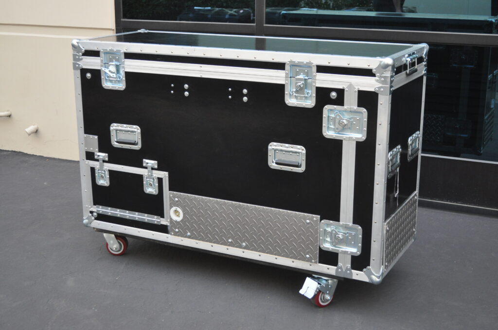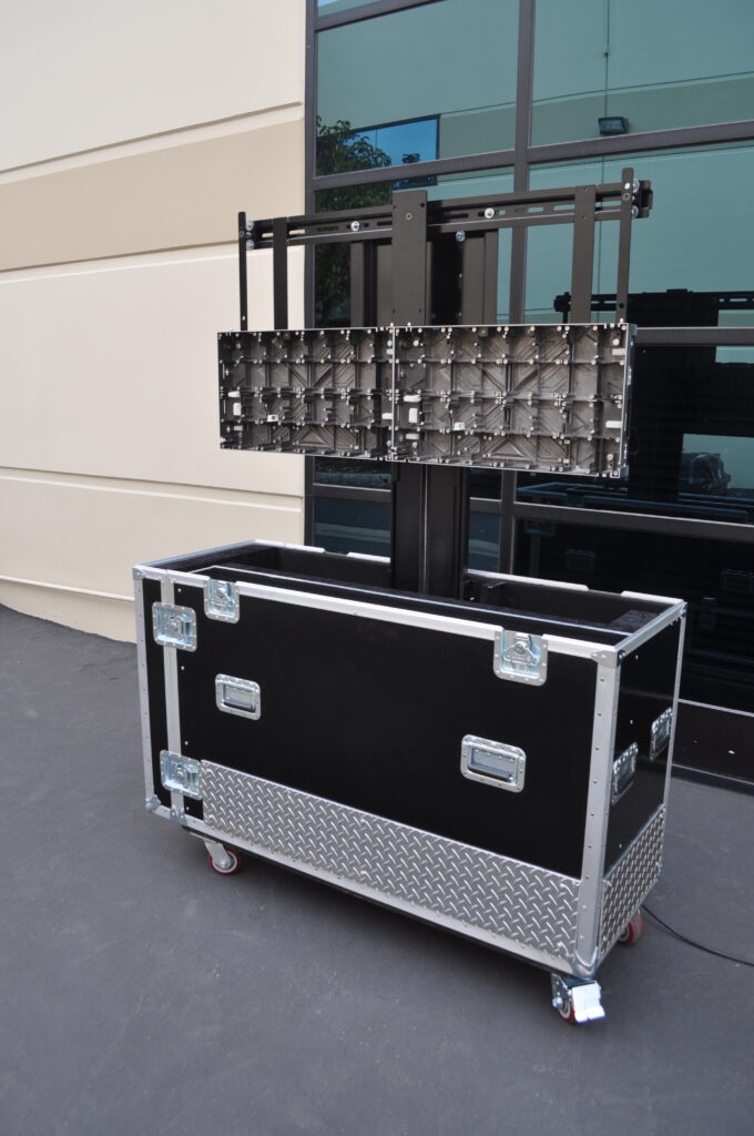 The Mobile Matrix comes pre-assembled, and ships in its own durable road case. The Mobile Matrix’s design is ideal for quick set-up and tear-down. Once set up, the bottom of the panel has a minimum height of 29″ from the floor, with a maximum height of 42″ when fully deployed. Once in the fully raised position, the dual panel doors can be swung open to either a flat 180 degree orientation, or positioned anywhere in between, enabling the system to be powered up for use. To expand the wall horizontally, simply add as many Mobile Matrix units as desired.